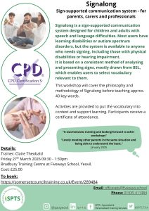 « All Events This event has passed. Signalong 27 March @ 9:30 am - 1:30 pm « Internal Booking External Booking » To book click here https://somersetcounciltraining.co.uk/Event/289484 Add to calendar Google Calendar iCalendar Outlook 365 Outlook Live Details Date: 27 March Time: 9:30 am - 1:30 pm Venue Fiveways School Victoria Rd Yeovil, BA21 5AZ United Kingdom + Google Map